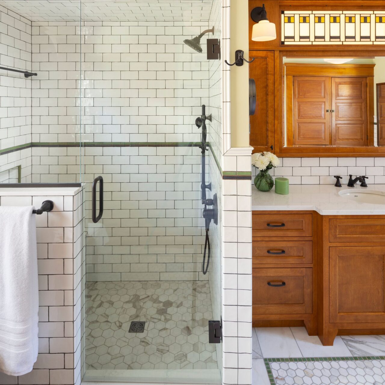 We used the former closet space to create an open-concept tub and shower area. A frameless glass panel separates the two, keeping the layout open and easy to move through. To keep the space comfortable year-round, we installed a bath fan with an integrated heater.